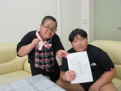 奉納相撲大会で入賞した2人の子どもが休み時間来てくれました。2位と4位!2人とも凄い!