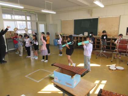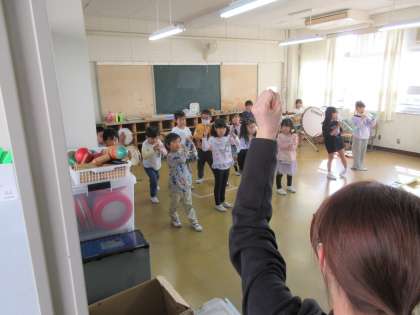 合奏の練習をしていました。みんなとても上手です。お話をしっかり聞いてリズムよく演奏できています。特に打楽器の安定感が抜群です。