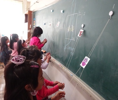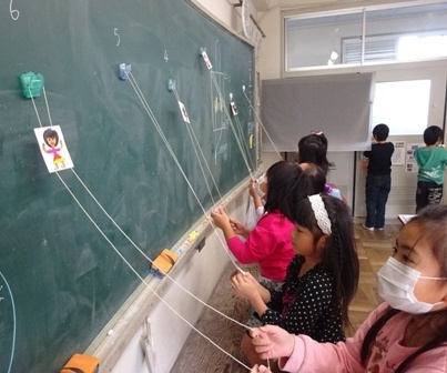 2年生が、黒板などに糸をぶら下げて楽しい遊びをしていました。