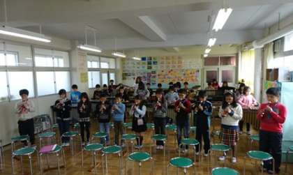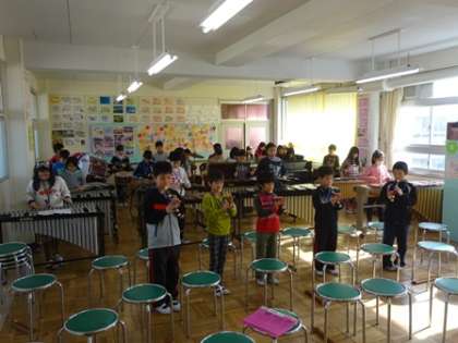 合奏の音に釣られて音楽室に入ると、4年生が4・5・6年音楽会の練習をしていました。曲の紹介から始まり、指揮者が前に立ってクラスの発表曲「あしたがあるさ」と「茶色の小びん」を続けて演奏しました。