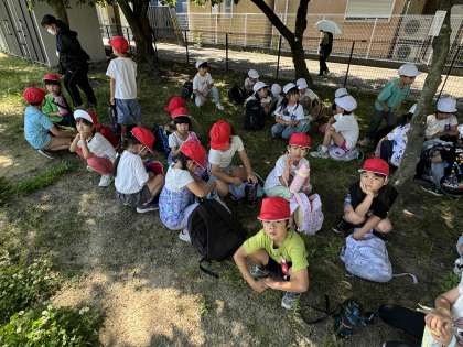 1年生は遠足で南郷公園に来ています。暑い中歩いたのでお茶が美味しそうです。