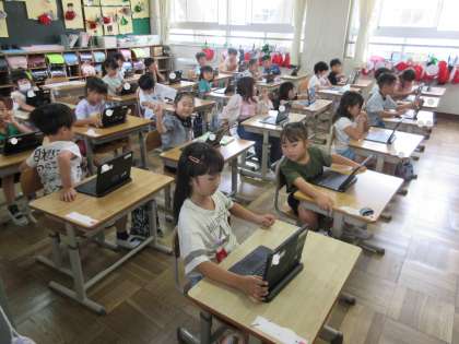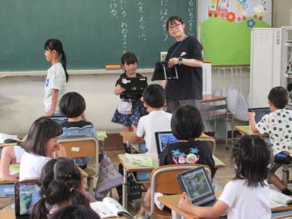 昨日の遠足の時間に撮った写真を使っての国語の時間。何を撮影したのかをクイズ形式に出題。問題の出し方、質問の仕方などのを学習していました。