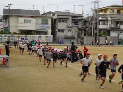 6年生が、学年でマラソンの練習をしていました。最初に女子が走り、次に男子です。5・6年生の走る距離は、1800メートルです。