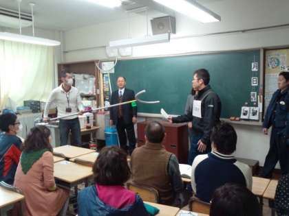 本日1月16日(金)、午後4時より、四條畷警察の方々に研修講師をお願いし、防犯・不審者侵入対応研修を開催いたしました。研修では、防犯、特に不審者侵入時の対応について、防犯グッズ使用の基本などについて説明があり、実際に教職員が対応訓練、使用体験を行いました。