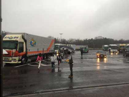 草津バーキングエリアで1回目のトイレ休憩をとり、只今出発しました。小雨が降ってますが、高速道路は順調に進んでいます。子ども達も元気な様子です。