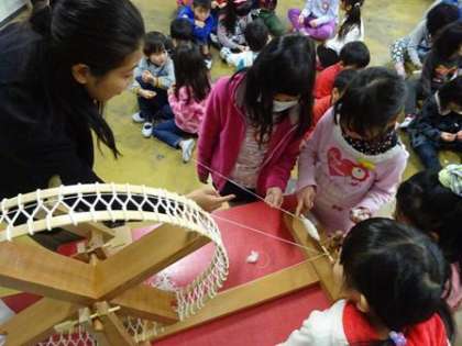 武井先生に綿から糸を紡いでいく実演をしてもらい、また、実際に体験もさせてもらいました。
