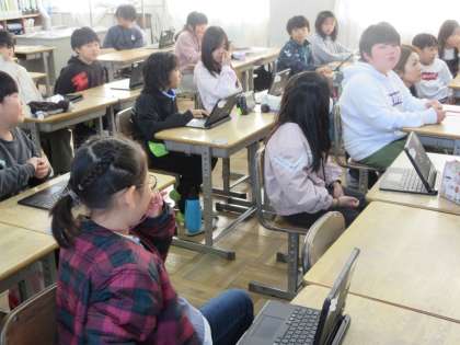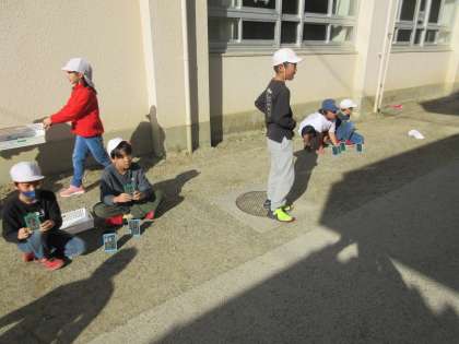 理科で太陽の光の性質を調べています。鏡で反射させ、一点に光を集めています。誰もが一度は経験したことのある実験です。