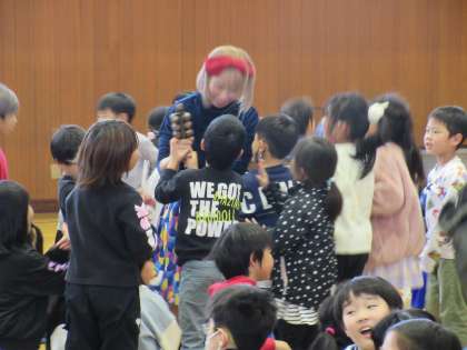 パーカッショングループ「フラワービート」さんによるライブ。1〜3年生はノリノリ。