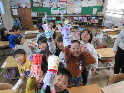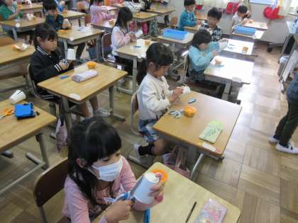 図工の時間紙コップを使った工作。パクパクするおもちゃを作っていました。満足のいく出来栄えのようです。