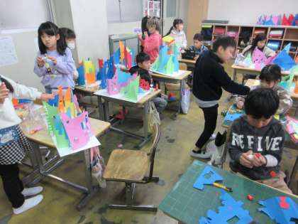 色画用紙を切り抜き、立体作品をつくりました。見事な出来栄えです!