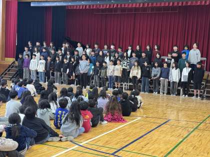 最後は6年生の合唱。そして代表の子の立派なあいさつで締めくくります。1〜5年生の子どもの出し物を優しい眼差しで見つめていた6年生。随分立派に成長しましたね。