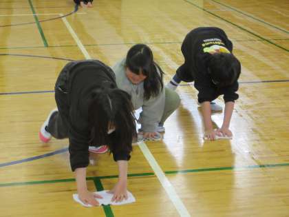 5年生の子どもたちが体育館の椅子片付け、床拭きをしています。たくさんの人間が関わっている卒業式。みんなの思いを胸に卒業していくんですね。