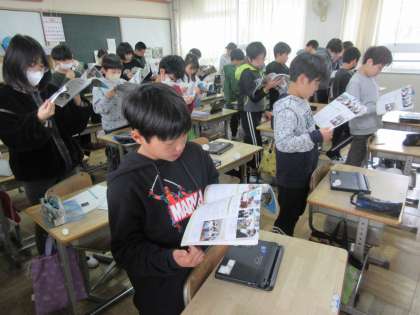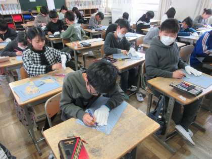 彫刻刀で自画像の版画を彫っていました。下絵はタブレットPCを活用してバッチリ。あとは腕次第!