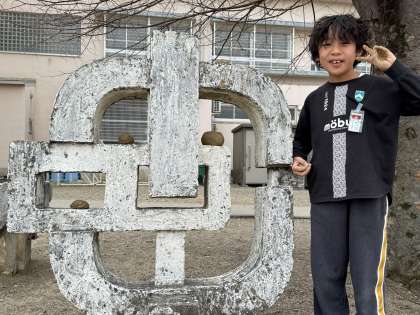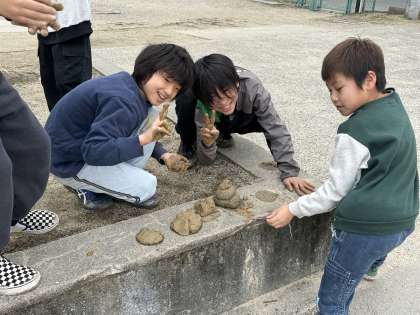 隅っこでコソコソ遊んでいる子たちがいました。泥遊びをしていたようで自慢気に見せてくれた作品は・・・。