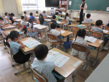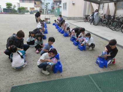 中庭付近でアサガオの種を植えていました。肥料の粒を見て「大きい!」とびっくりしていました。明日から毎日水やりが始まります。