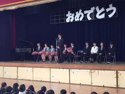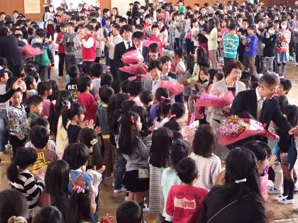 お一人ずつに花束が贈られ、体育館で花道をつくってお送りしました。本当にお世話になり、ありがとうございました。お元気で。