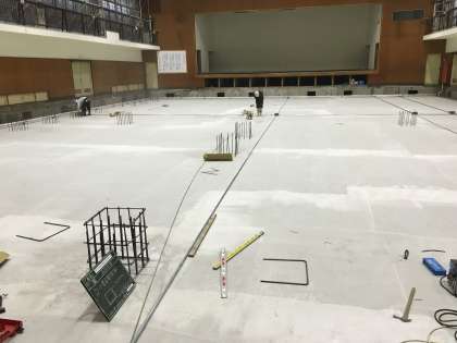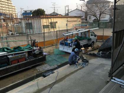 年末に流しこまれた基礎のコンクリートが固まり、次の工程作業が始まっています。