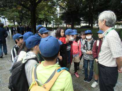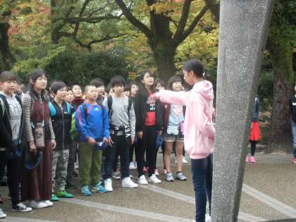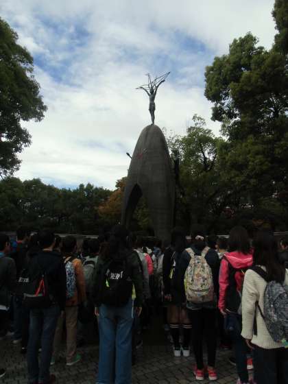 広島につくと、雨が強かったため、まず資料館を見学しました。とても見学者の人数が多かったのですが、みんな真剣に展示物を見ながらメモを取っていました。その後は、原爆の子の像の前で平和セレモニーをしました。実行委員が平和の誓いを言い、みんなで歌を歌いました。氷野小学校のみんなが作ってくれた千羽鶴も、届けることができました。平和のために、まず自分ができることを考える。大切なことですね。碑巡りでは各グループごとに、説明するガイドさんがついて下さり、丁寧に教えていただきました。