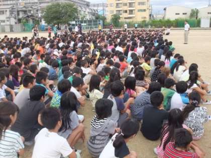 「大阪880万人訓練」に合わせて本校の地震避難訓練を実施しました。午前11時に発信された緊急地震速報を受け、行動を開始。校内緊急放送、机の下等に入っての身の守り、揺れが収まってからの運動場への避難まで、緊張感をもって行いました。お隣の氷野保育園も避難してきました。