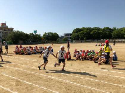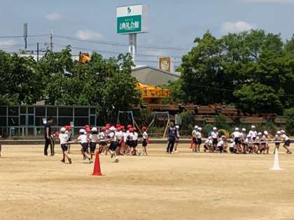 水はけの良い運動場ですが、先生たちが朝から水たまりの水を抜き、整備をして1時間目から運動会の練習ができました。