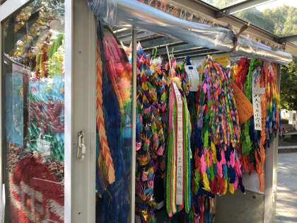 広島平和記念公園です。たくさんの思いが千羽鶴にこめられてささげられています。