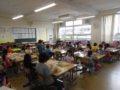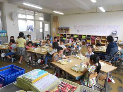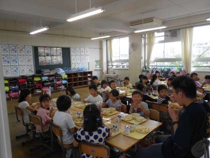 今日の献立はハムピラフ、アスパラソテー、トマトミートボールスープ、すだちゼリー、牛乳でした。