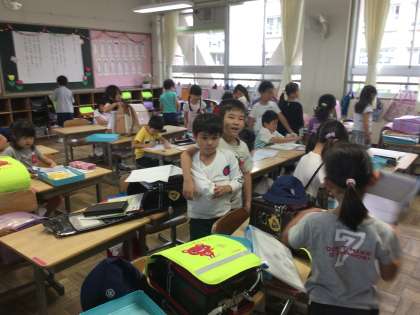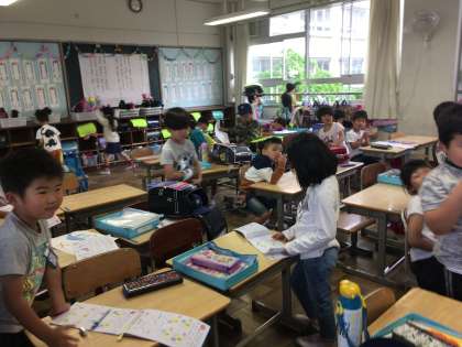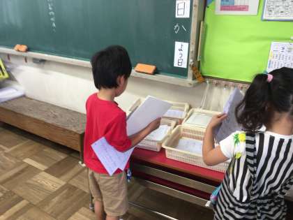 写真は朝の準備を準備をする1年生です。てきぱきと提出物をカゴに入れています。