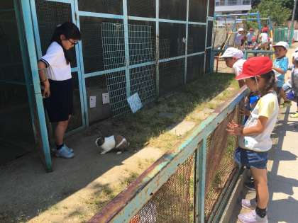 うさぎの「ラピ」を見学している人が多かったです。小屋の外でよく遊ぶラピは、氷野小の人気者のようです。
