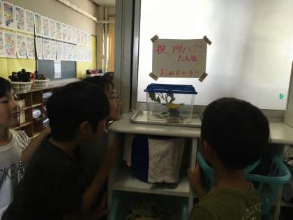 朝、3年生が「3組のさなぎがまたアゲハになったよ」と教えてくれました。みんなうれしそうな表情で覗き込んでいました。