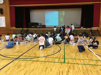 4年生の理科の授業風景です。体育館での3クラス合同授業です。