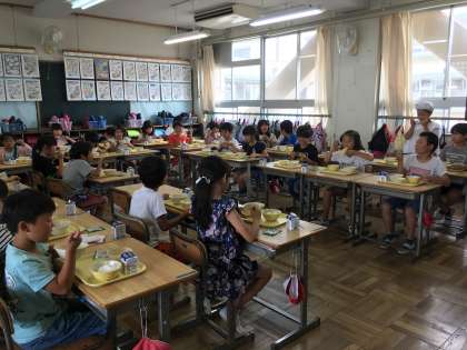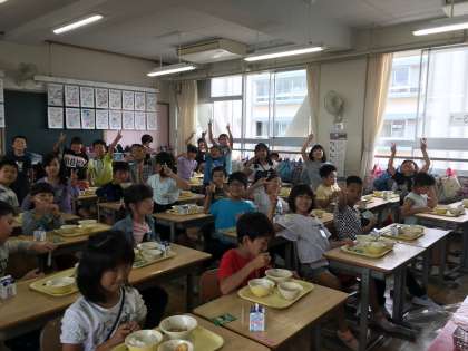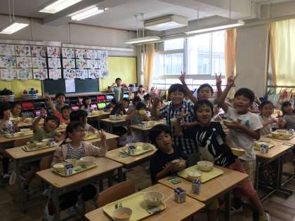 今日の献立は、ふりかけ、イカの天ぷら、ごはん、豆腐の中華煮、牛乳でした。