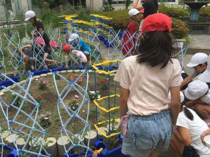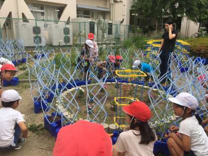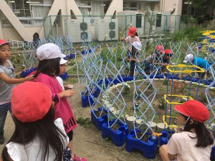 1年生が虫探しをしている横で、2年生がミニトマトに追肥をしていました。にぎやかな中庭でした。