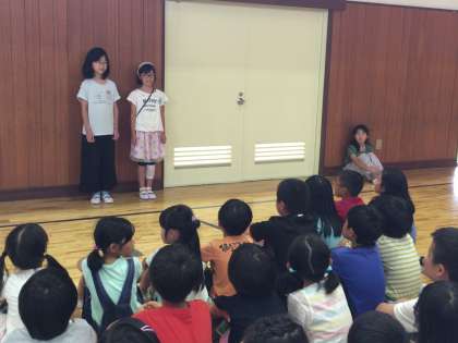 今日の昼休み、体育館で3年2組と4年2組が遊び交流会を行いました。
