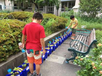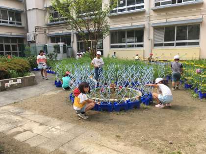 今朝の中庭風景です。「校長先生、朝顔が咲いたよ」と1年生が教えてくれました。皆さんが毎日お世話をしてくれているおかげです。