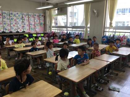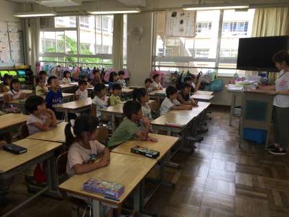 1年生の朝の会を参観しました。担任の先生が皆さんの名前を呼ぶと、みんな大きな声で「はい」と返事をしていました。とても素晴らしいです。