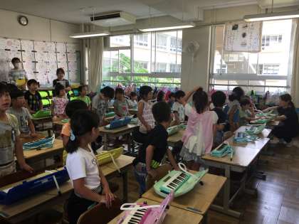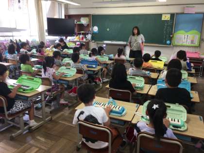 鍵盤ハーモニカを使い、演奏の仕方や鍵盤の「ド」・「ソ」の位置を覚えました。これから演奏できる曲がどんどん増えると楽しいですよ。