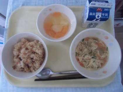 今日の献立は「中華風かやくごはん、五目たまごスープ、フルーツカクテル、牛乳」でした。今日は朝から楽しみにしていた子どもも多い人気献立で、教室を回っていると「今日好きなのばっかりや〜。」「絶対おかわりするねん!!」と気合十分の子どもたちでした。今日はごま油の風味がきいたとてもおいしい混ぜご飯、「中華風かやくごはん」のレシピを紹介します。