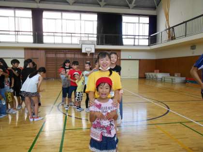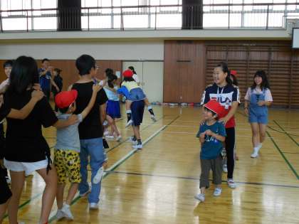 1時間目の体育館で、6年生と1年生が遊び交流会を行っていました。6年生がとても優しく、1年生も大喜びです。