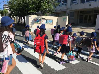 日差しが暑いです。今日は四年生の社会見学です。この後出発です。