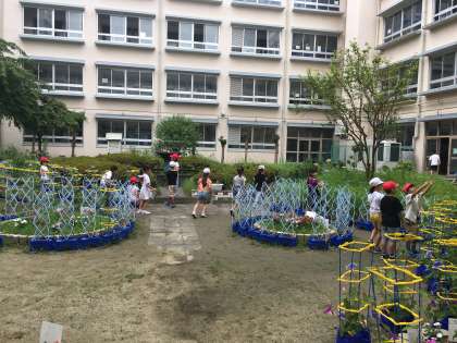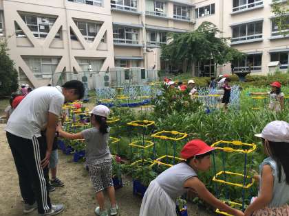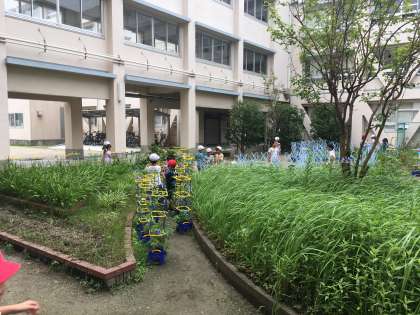 朝の中庭です。河盛先生に、朝顔のお話をしてくれています。