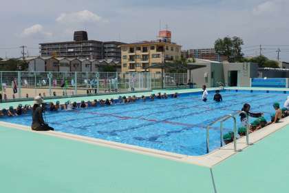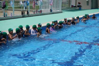 1年生は3,4時間目にプール指導がありました。プールサイドはとても暑く、今日は最高のプール日和です。