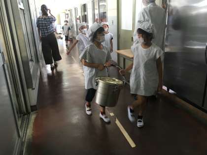 食缶を運んでくれている1年生です。食缶が重そうです。