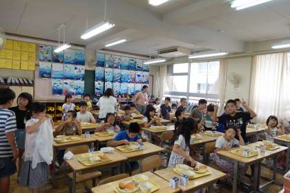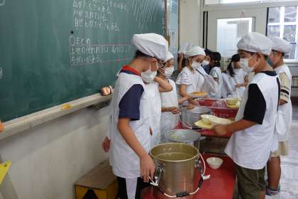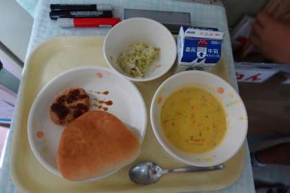 今日の献立は、バーガーパン、キャベツソテー、かぼちゃのポタージュ、豆かつ、牛乳でした。今日は3年生におじゃましました。