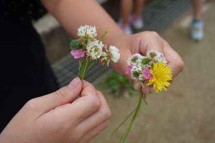 植物図鑑をもって、お花を探しに行きます。担任の先生にプレゼントするそうです。