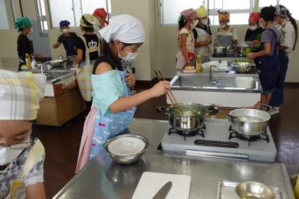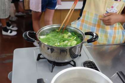 チンゲン菜を茹でています。鮮やかな美味しそうな色になってきました。