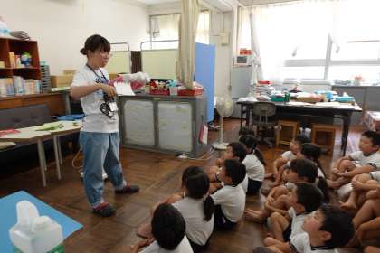 今日は2年2組が、ブラッシングや虫歯のお話を聞きました。