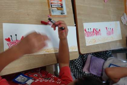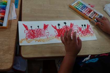 5時間目、1年生は図工の授業でした。「おさんぽカニさん」を上手に描いていました。