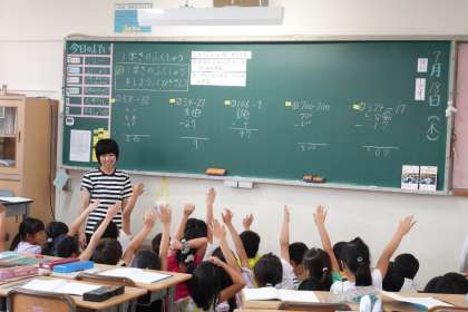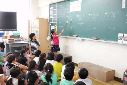 算数の授業を見学しました。いつもと違う授業風景で、最初は絵本の読み合せだと思ってました。