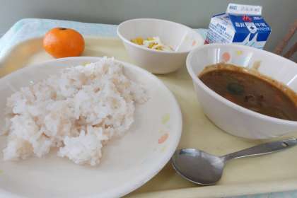 1学期最終の給食です。今日の献立は、枝豆コーン、夏野菜のカレーシチュー、玄米ご飯、冷凍ミカン、牛乳でした。