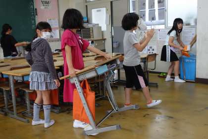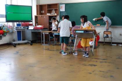 4年生の教室をのぞいてみました。一生懸命教室そうじをしてくれています。